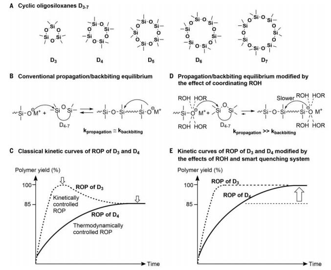 總之,本工作通過(guò)醇與陰離子鏈端的配位避免矽氧烷鏈的反咬過(guò)程,同時(shí)利用季膦陽離子抑制環反咬反應的發(fā)生,實現了八元矽氧烷環D4的熱力學(xué)控制ROP,避免産生環狀低聚矽氧烷副産物。