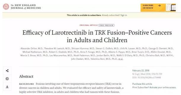 larotrectinib的多方面(miàn)研究結果已經(jīng)由聯合首席調查員DavidHong教授和紀念斯隆-凱特琳癌症中心的早期藥物開(kāi)發(fā)的負責人DavidHyman博士于2月21日發(fā)表在NEJM上。